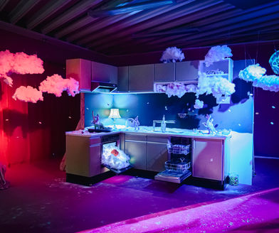 Through Samsara, we move to the final space, where a film featuring an "alien" awaits us. These entities previously appeared in Bamberger’s earlier work, The Canis Lunatics, introduced as colossal beings living beyond time and space, inhabiting energetic realms. “I think extraterrestrial life has always been on Earth, because the entire universe is part of the same whole. They come from another atmosphere and cannot breathe here, but they perceive the subtle energy we can no longer see.” Gas masks protect the aliens from Earth’s atmosphere, forcing them to rely on intuition. The ambiance in this final space is softer, lighter. We see an alien engaged in the mundane act of flipping a pancake, but when held up to the light, the pancake resembles a moon or even an entire galaxy. Does this small gesture casually recreate the universe’s creation? Does it signal an end or a new beginning? Or does such a question matter in a cycle of eternal return? As a finale, it’s a humorous leap from the everyday to a higher, timeless whole, where life’s playfulness and lightness return.